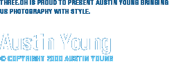 Austin Young threw in his degree in Art in Paris for a career as an artist in New York -- a decision that seems to be working out fairly well, judging by his humorous, astute and exuberant portfolio and website. For those impressed by these sorts for things (myself included), he has shot - amongst others - Debbie Harry, Sandra Bernhard, David Arquette, Oliver Stone, Orbital, himself, Marc Almond, Dame Edna and (a personal favourite) Blackalicious. And what a demonstrative portrait it is, capturing the trajectory of their diffidence set against diminishing neon lights; more specifically capturing their diffidence to the neon lights of the 'Rap' world. An apposite statement if anything.